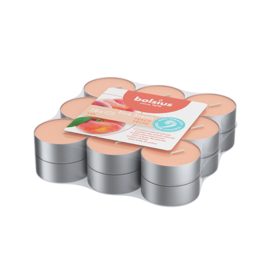 Deze Bolsius True Scents geurtheelichten Fruitig Oranje brengen een frisse, sprankelende en fruitige geur in huis. De verpakking bevat 18 theelichtjes, elk met een brandduur van ongeveer 4 uur. Met hun standaardafmeting van Ø 3,8 cm × H 1,8 cm passen ze in vrijwel iedere waxinelichthouder.